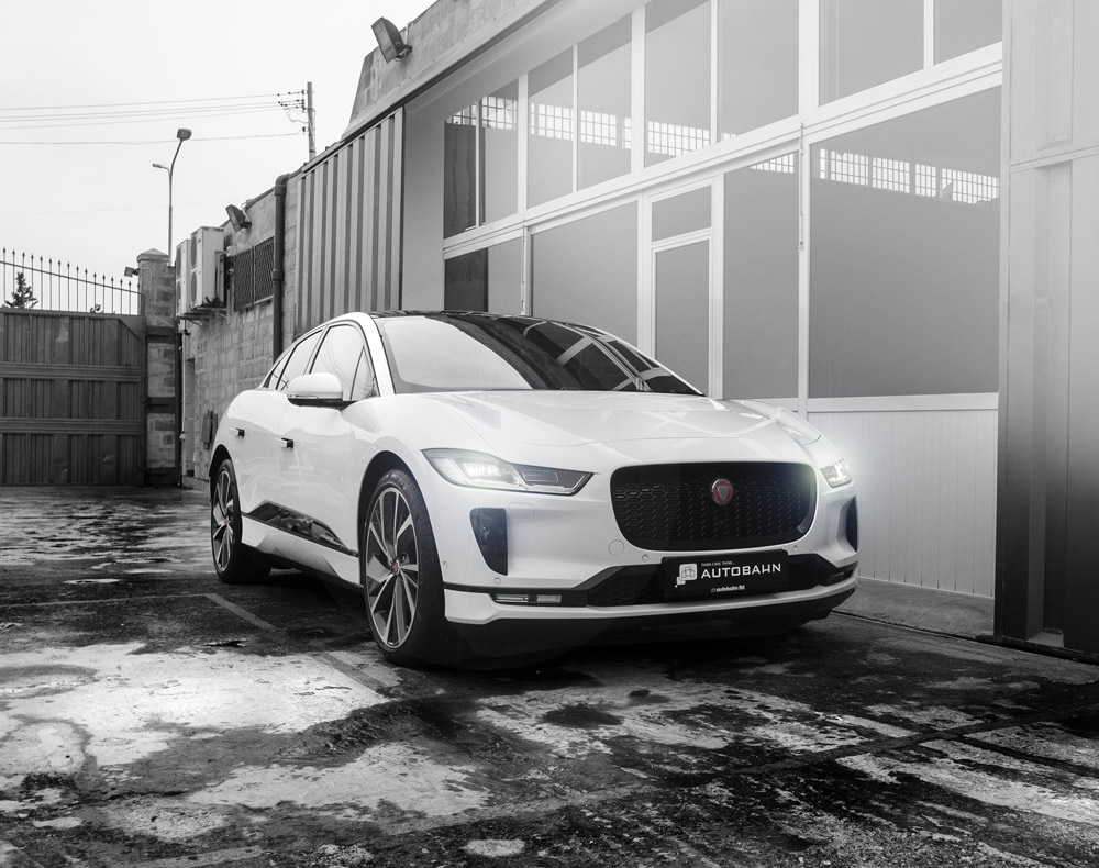 Car promo photography of Jaguar iPace in stylized, atmospheric B&W shots.